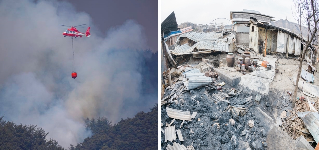 ▲ 산불 진화 중인 헬기(행정안전부 제공)                                                             ▲ 산불로 전소 된 가정