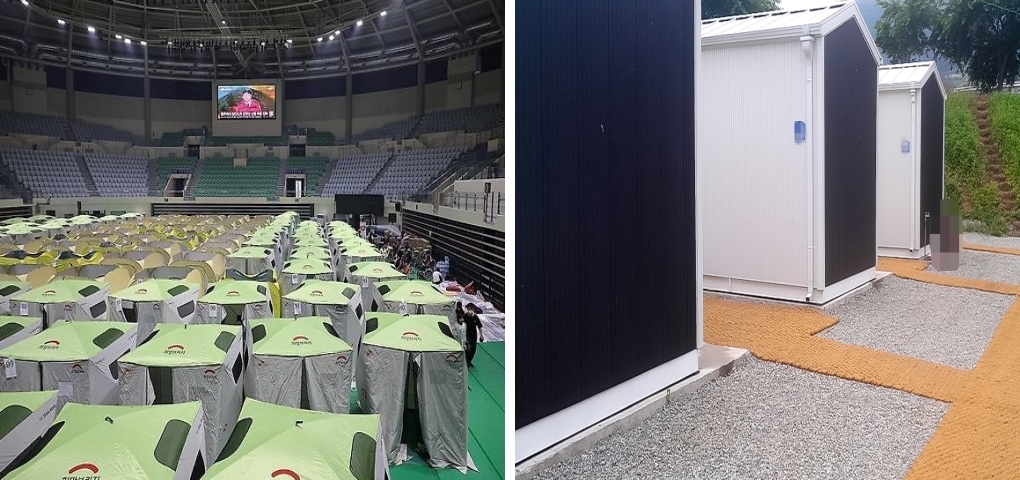 ▲ 안동 시청에 마련된 산불 피해 이재민 긴급 대피소                                                       ▲ 컨테이너 임시주택